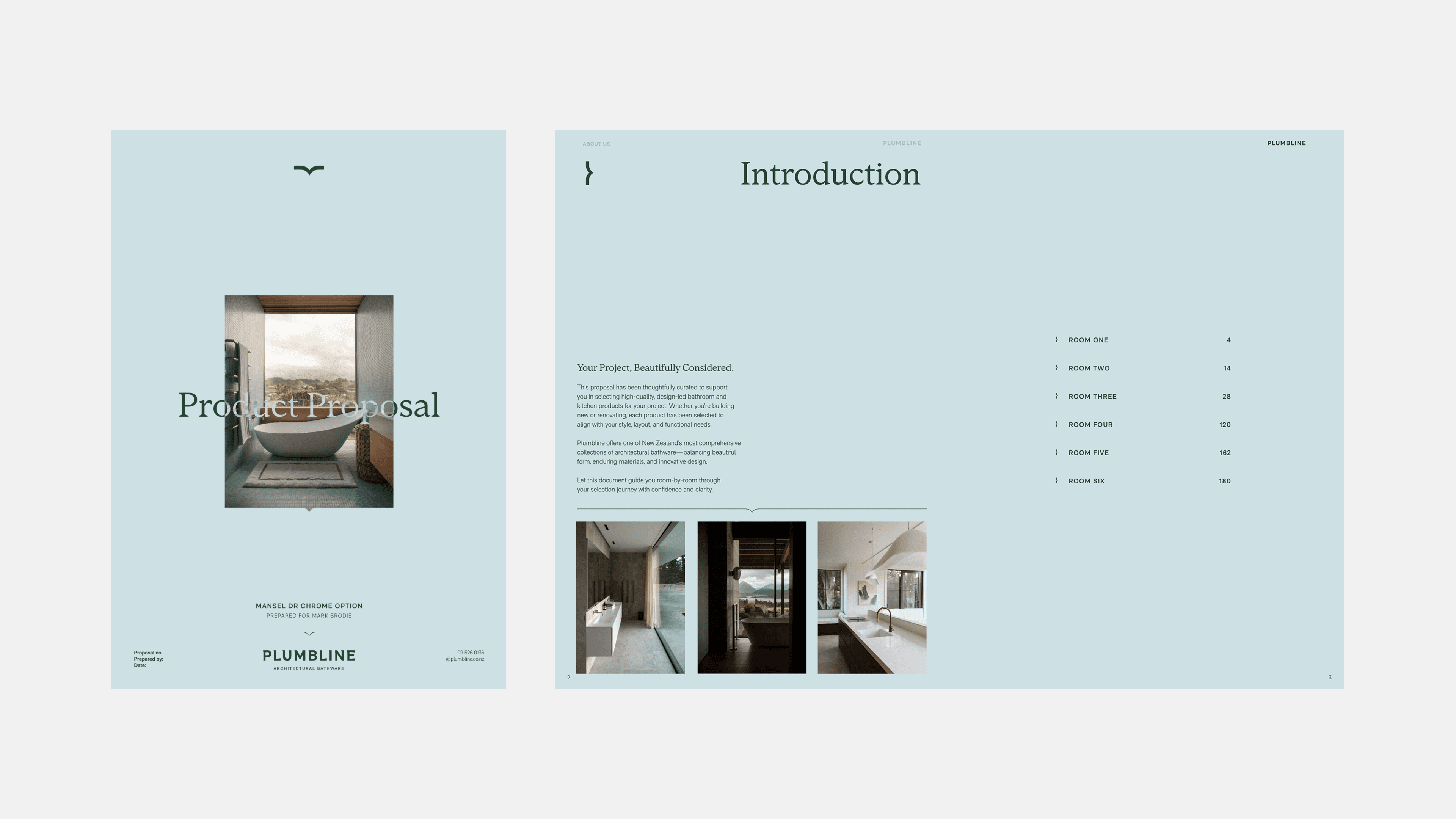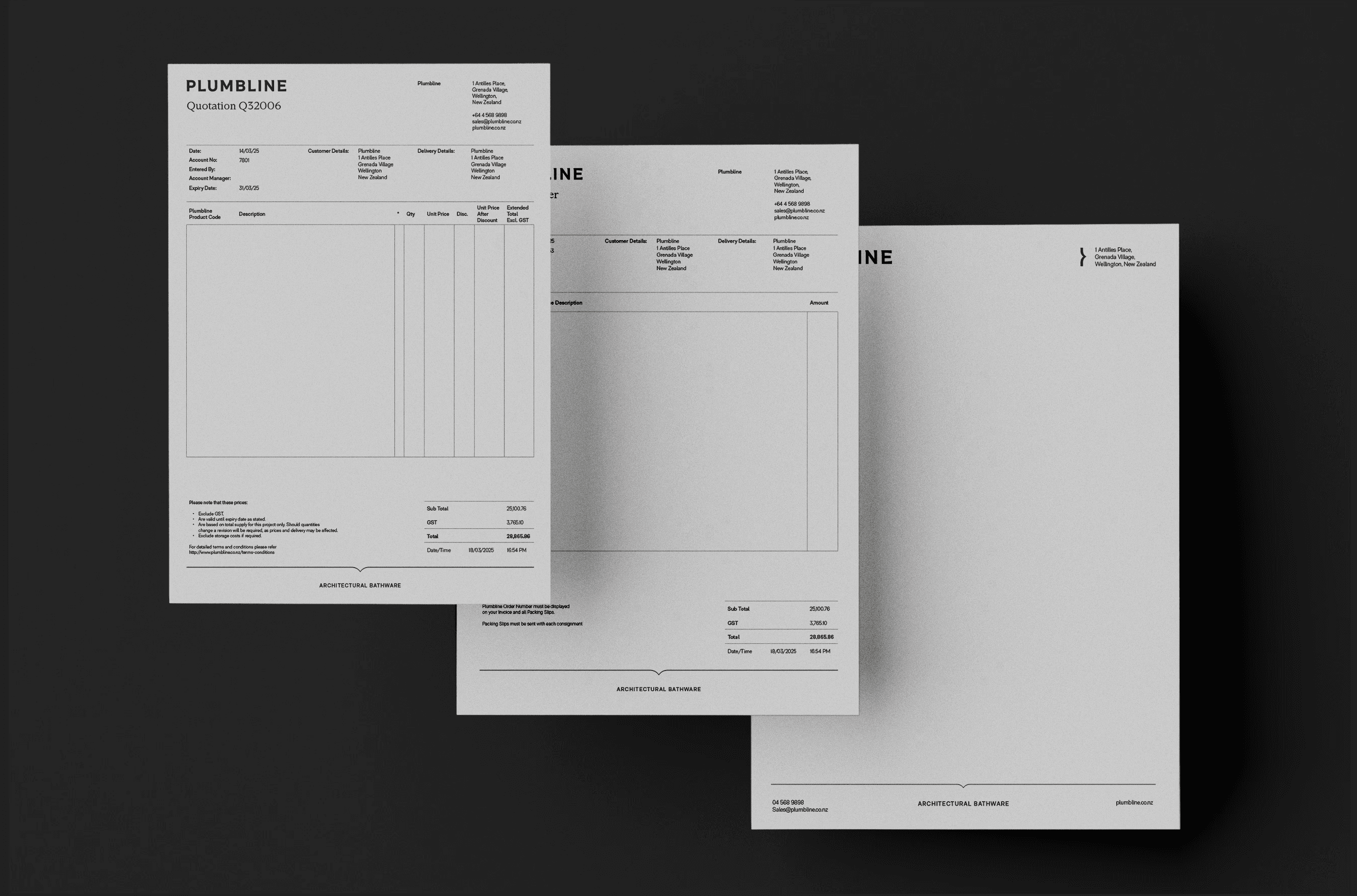 From the 300-page product catalogue to the high-end By Design collection, every print piece was built to a consistent grid system. Production spanned the full range of Plumbline's trade and commercial touchpoints, quote and invoice templates, project proposals, signage, and branded collateral.