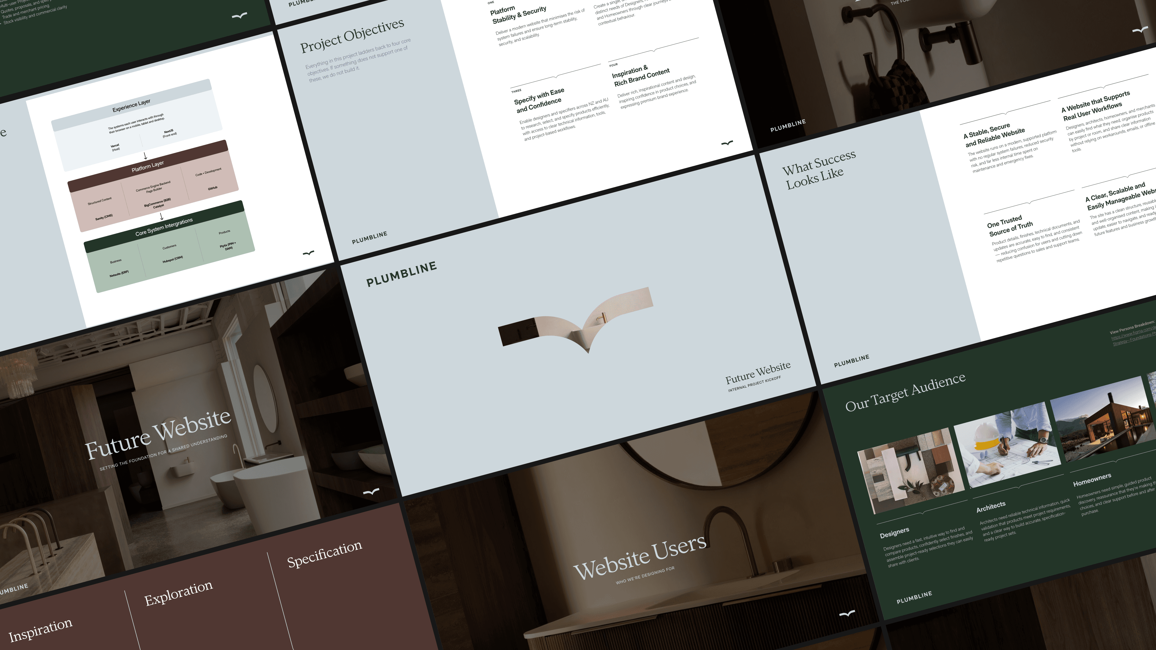 Digital work covered Plumbline's web presence and internal product tools. Designs were created in Figma and handed off to development, spanning the homepage, collection pages, landing pages, sample and swatch pages, and an internal portal interface. Alongside web, I produced presentations across Figma and PowerPoint for internal, client-facing, and trade purposes.